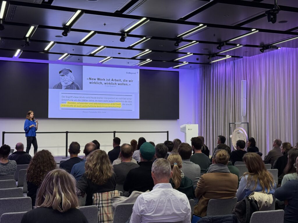 Nicole Kopp eröffnete ihren Impuls mit einer kritischen Reflexion über den Begriff „New Work“, den sie als Container-Konzept beschrieb – ein Begriff, der von vielen unterschiedlich interpretiert wird und oft als Projektionsfläche für individuelle Bedürfnisse dient. Ursprünglich von Frithjof Bergmann als „Arbeit, die wir wirklich, wirklich wollen“ definiert, steht New Work heute für flexible, selbstbestimmte und sinnstiftende Arbeitsformen. Die aktuelle FlexWork Trendstudie 2024 zeigt, dass rund die Hälfte der Schweizer Erwerbstätigen zumindest gelegentlich mobil arbeitet und etwa ein Drittel bereits Praktiken wie Kanban oder Scrum nutzt. Diese neuen Arbeitsformen gehen mit einem erhöhten Empowerment-Erleben und einer besseren Life-Domain-Balance einher – allerdings nicht für alle gleich. Damit zeigt Kopp auf, dass mentale Gesundheit und New Work eng miteinander verbundene Themenfelder sind, die sie in der Praxis oft antrifft.